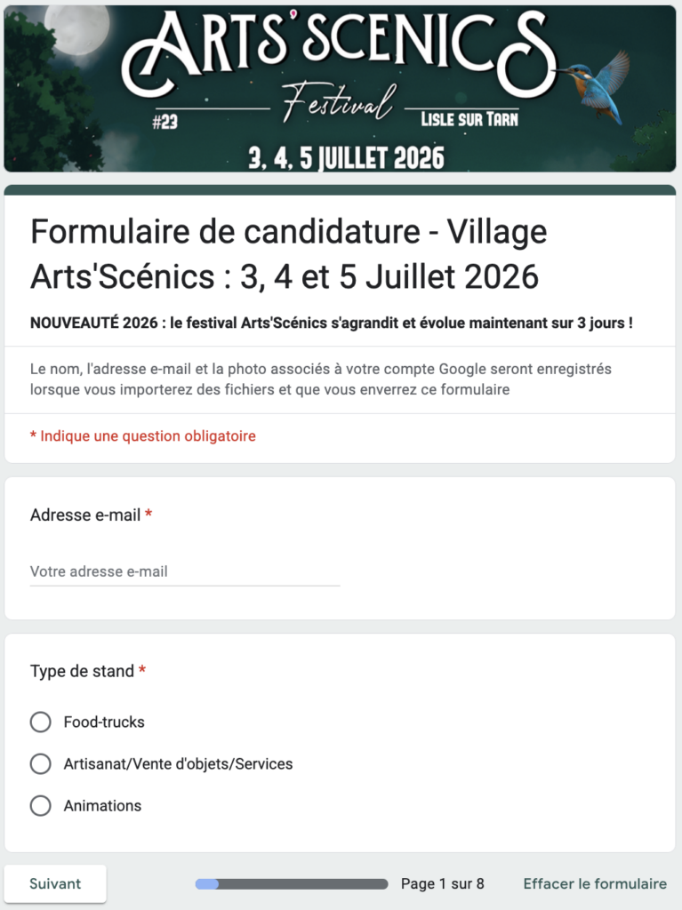 Pour participer en tant que foodtruck ou artisan, c’est ici que ça se passe. Pour postuler au village du festival, il vous suffit de remplir le formulaire ci joint.